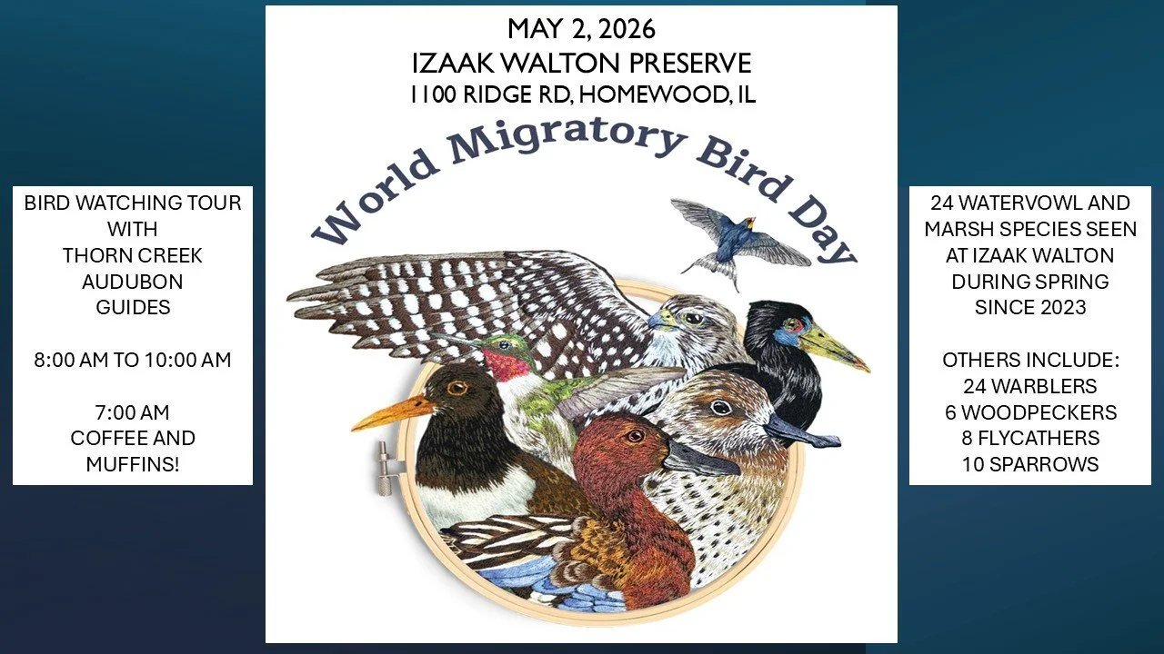 Enjoy a bird watching tour with Thorn Creek Audubon guides from 8am - 10am. There will be coffee and muffins in the cabin at 7am!